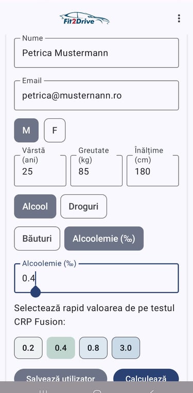Calcul alcool: Colectează vârsta, greutatea și înălțimea; permite selectarea rezultatului măsurat al testului de alcool; calculează timpul estimat până la atingerea pragurilor legale relevante.