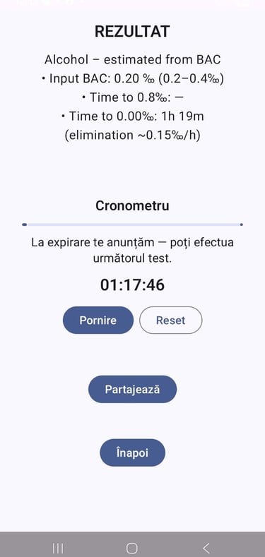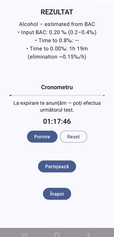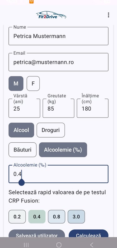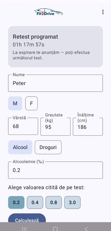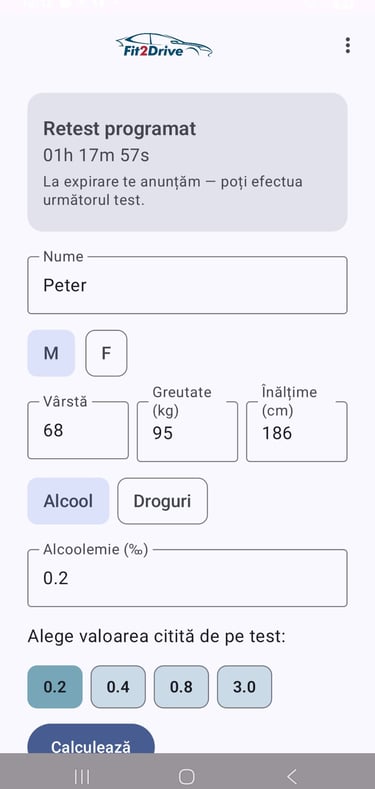 Calcul alcool: Colectează vârsta, greutatea și înălțimea; permite selectarea rezultatului măsurat al testului de alcool; calculează timpul estimat până la atingerea pragurilor legale relevante.